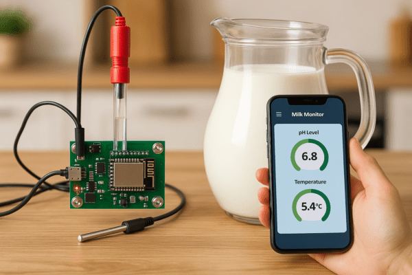 Milk is one of the most consumed products worldwide, but it spoils quickly due to temperature changes, contamination, and poor storage. This project brings IoT + AI intelligence into your kitchen or dairy setup! Using a pH sensor and temperature sensor, the system continuously monitors milk quality in real time. If the pH drops (indicating souring) or the temperature crosses unsafe limits, it instantly sends alerts to your mobile app dashboard.